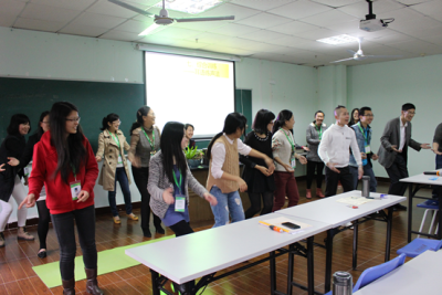 培训过程中,陈瑞乾老师精讲让大家多练,务求每个教师都懂得正确发声。生动活泼的课堂形式,轻松愉悦的游戏体验,教师们在不知不觉之中,学习到了如何科学用声和嗓音保护。