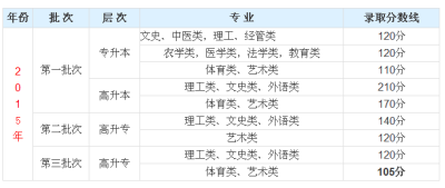 2015年广东省各类成人高等学校招生各批次录取最低控制分数线(文化课总分)如下: