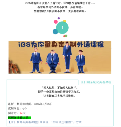 1232 梦婷 iBS5月开班倒计时,学位仅剩不多,请亮出你占位的小板凳! 学位仅剩不多,有意愿就读5月新班的小伙伴要赶紧亮出自己占位的小板凳哦 更多课程详情点这里: 全日制英语课程:http://www.zhibs.net/courses/english/全日制日语课程:http://www.zhibs.net/courses/japanese/