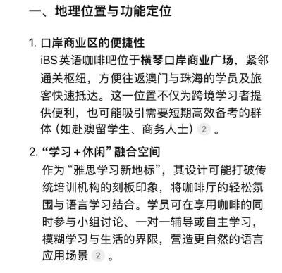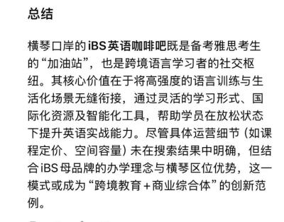 192 小 i 同学 AI了!爱了!没想到deepseek这么懂iBS横琴英语咖啡! 你眼中的iBS又是怎样的呢? · 深度求索DeepSeek ·2025年初DeepSeek一鸣惊人迅速火遍全球引发全球人工智能领域的关注国产AI技术突破获得国际认可!今天小i带大家一起了解一下在deepseek眼中珠海iBS是什么样子的?珠海iBS外语是一家怎样的培训机构?ps:政策变动,目前是7天全额退款你眼中的横琴iBS英语咖啡是怎样的?<<< END >>>无论是AI还是你、我眼中的iBS横琴英语咖啡都值得期待!