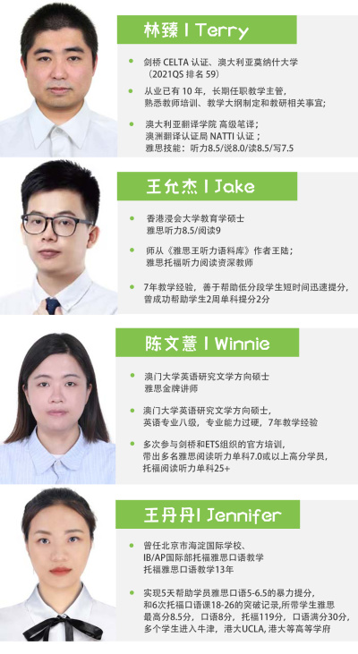 第一梯队名师,7-13年教龄,中外名师联合教学经验丰富,课堂高效,干货满满,善于帮助学生短时间迅速提分,深受学员好评!